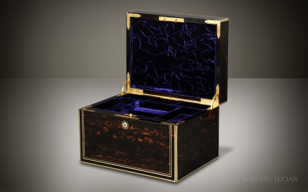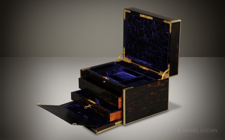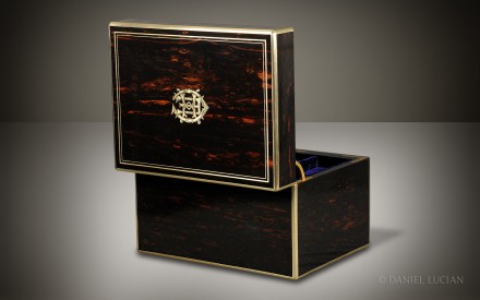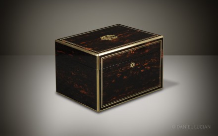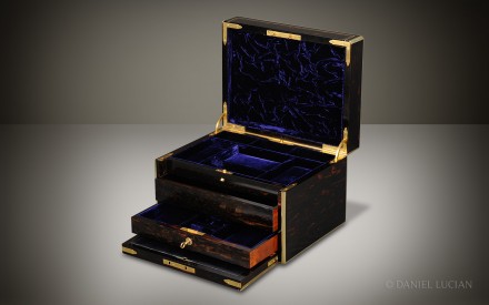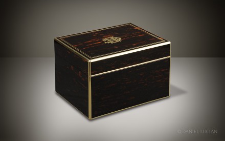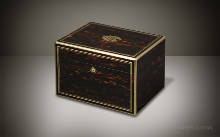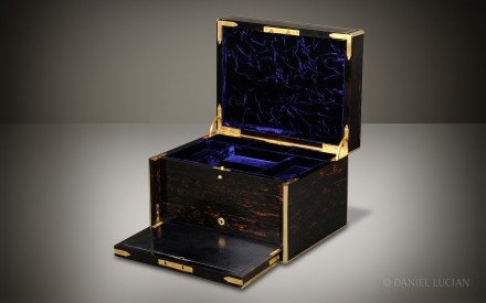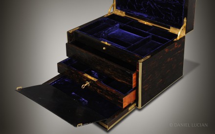 This smart Coromandel antique jewellery box, edged in brass with decorative inlaid brass stringing, dates from the 1860s. The engraved brass monogram of 'C.E.H' is inlaid into the lid and denotes the initials of box's original Victorian owner.