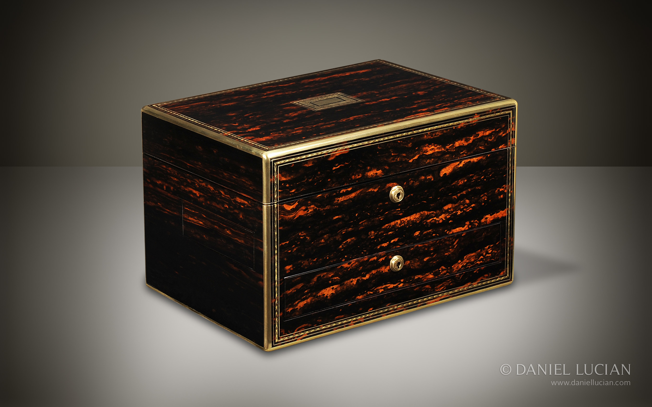 The exterior of the box is veneered in figured Coromandel wood, edged in brass, with delicately engraved brass inlay to the front and top. The inlaid brass central escutcheon, as well as the two front Bramah locks, are also decorated with fine engraving.