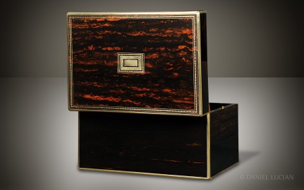 A brass inlaid Coromandel framed mirror is fitted within the lid. Once removed, this mirror uncovers a leather-bound secret letter wallet behind.