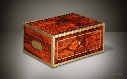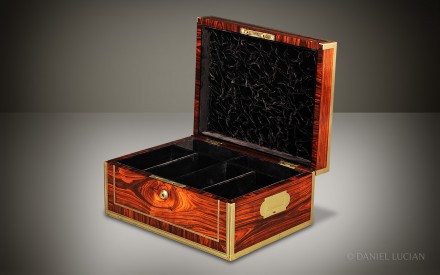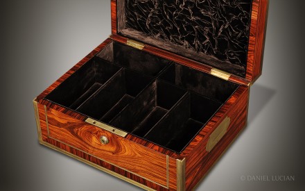 The interior is lined and ruched with rich dark brown velvet, and partitioned into six cushioned sections. The front four sections have secret floors that lift up to reveal further velvet-lined compartments underneath.
