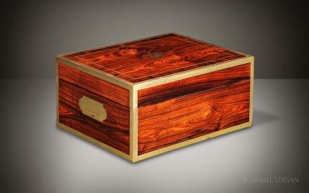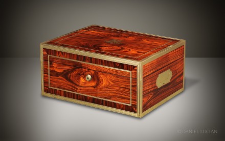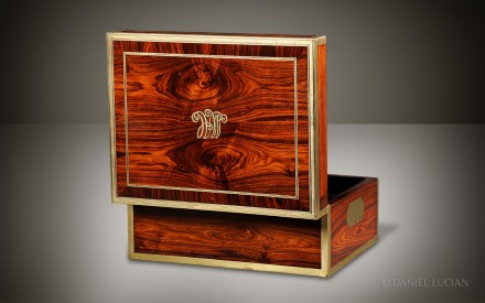 This early Victorian antique box is veneered and cross-banded in vibrant Kingwood. It is further enhanced by its right-angle brass edging, brass recessed side handles, and Bramah lock. The original owner's initials of 'M.A.C' are inlaid into the top of the lid.