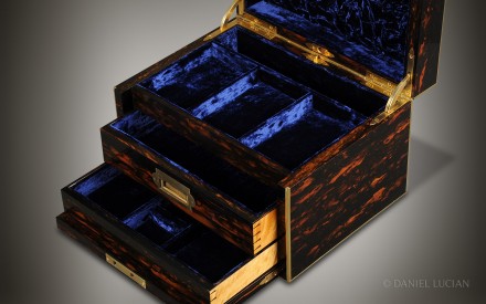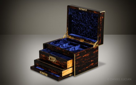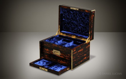 The front flap of the box, which holds the Bramah lock, drops forward to reveal two drawers. The top drawer, with its leather-lined interior, is opened by its brass recessed handle, whilst the bottom spring-loaded drawer is released by push button to the rear of the box's main compartment. The bottom drawer has an internal leather-bound writing surface lid with gold tooling detail. This lid conceals four further jewellery compartments and a ring/ cuff-link channel underneath.