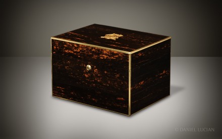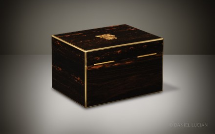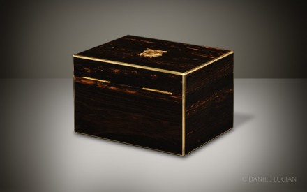 The box is veneered in Coromandel wood with attractive brass edging, an engraved ‘CGL’ brass monogram applied onto the lid, and a Bramah lock to the front of the box.