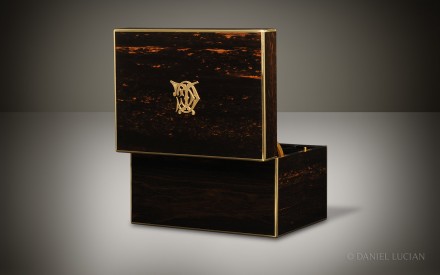 The interior of the box is lined and partitioned with dark purple velvet which contrasts beautifully with the immaculate gilding on the brass work. A push button to the rear of the box releases the spring-loaded front drawer, which contains a velvet-lined jewellery area and a full width ring/ cuff-link channel. A small gilt brass plate on the rim of the drawer reads, ‘Howell, James & Co, Regent Street, London’. A further push button on the left side of the box releases a side drawer with a leather-lined interior.